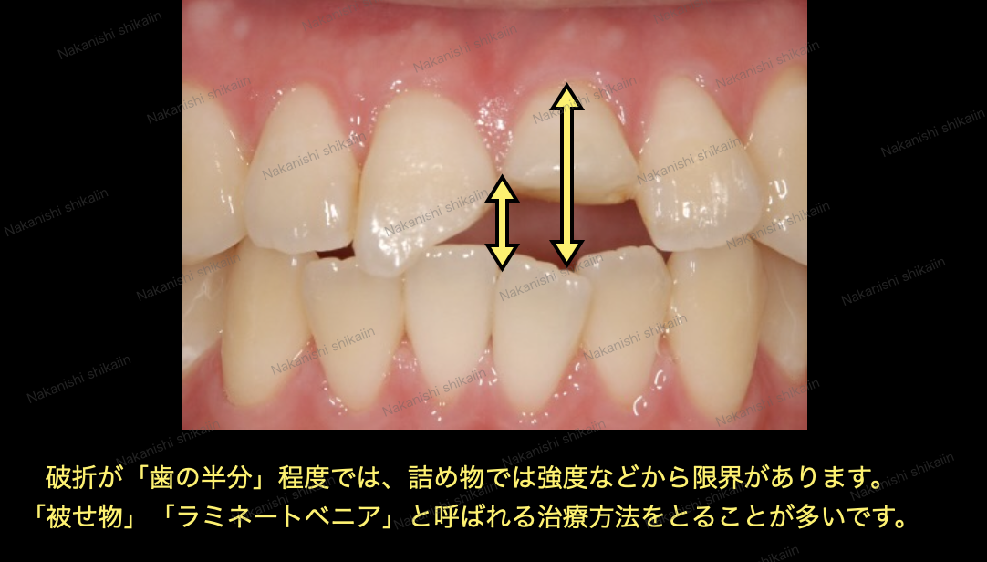 前歯がかけた時の範囲が大きい場合は詰め物では対応できないことがあります。それはやはり強度の問題です。ざっくりなところでは、歯の半分がかけていると厳しいかもしれません。