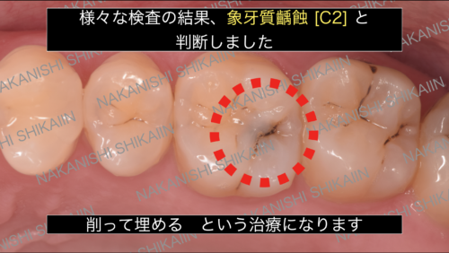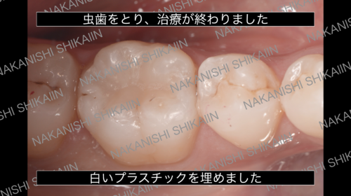 実際のところ、レントゲン撮影を行うと中の方が黒くなっていました。これは歯の構造でいう2つ目「象牙質」に黒さがあるため、治療が必要になります。虫歯の大きさにもよりますが、噛む面に限局している場合は、小さい範囲の場合は、プラスチックを埋めることが多いです。