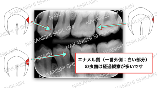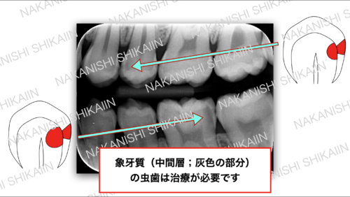 簡単にいうと、一番外側のエナメル質という範囲の虫歯は生活習慣、歯ブラシ、フッ素塗布で十分で、象牙質に入ると治療となります。